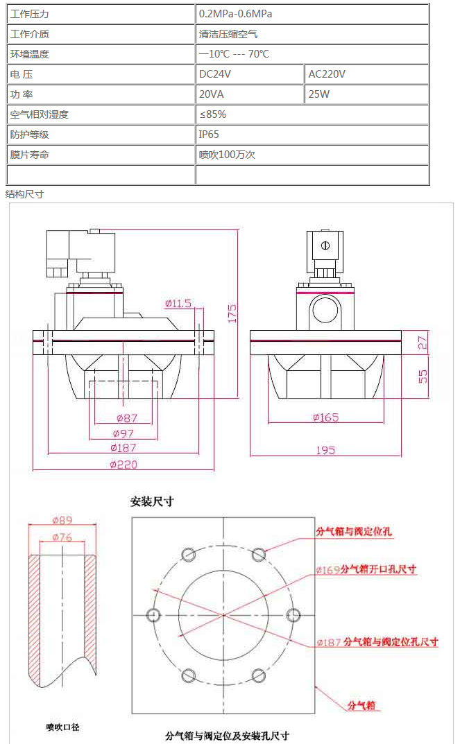 6. 该阀与气包及喷吹连接管的密封件适用温度为-10℃~70℃。如需高温密封件,请订购时另行注明。