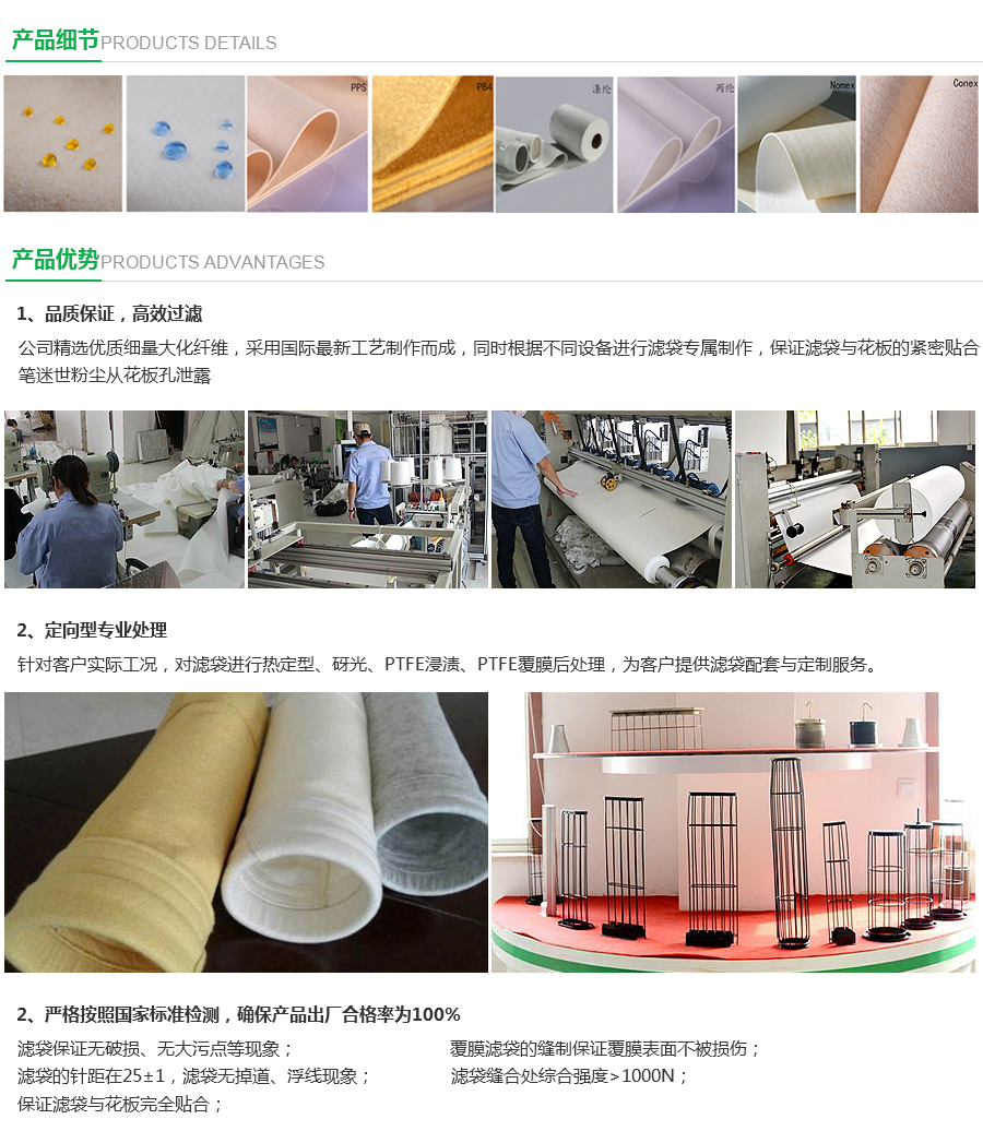 我们对针刺毡滤料采用碳氟树脂和PTFE浸渍处理的防油防水(拒水防油)处理,其对 湿含尘气体(尤其对吸水性、潮解性粉尘) 滤袋的表面更易捕集粉尘,避免和减轻糊袋现象的发生。