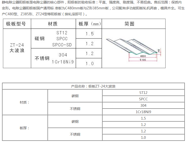 静电除尘器阳极板是电除尘器的核心部件,阳极板的验收标准:平直、强度高、刚度强、不易扭曲。售后范围:保质内变形。电除尘器阳极板国产通用标 准板为C480mm板与Z形385mm板,公司配有多功能阳板轧机两套,模具齐全。可生产C480型、Z385形、ZT24型等阳极板(换轧滚即可)。