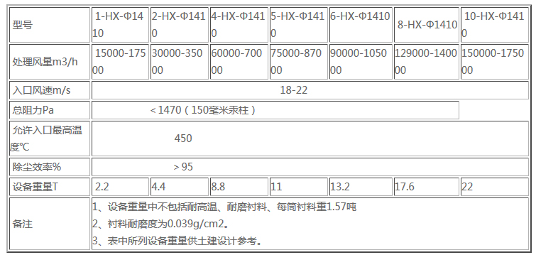 1、本除尘器可由单筒及数个单筒组合使用,单筒处理风量为15000-18000m3/h。